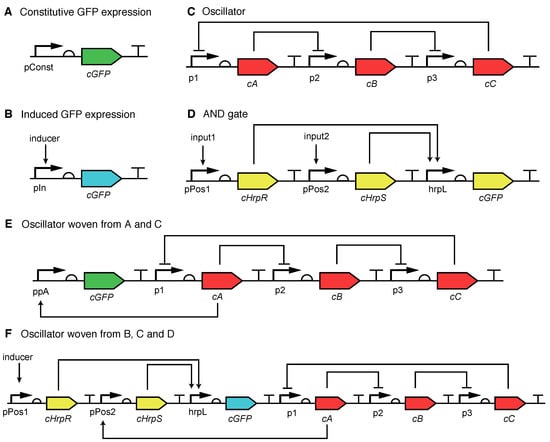- Elowitz, M.B.; Leibler, S. A synthetic oscillatory network of transcriptional regulators. Nature 2000, 403, 335–338. [Google Scholar] [CrossRef] [PubMed]