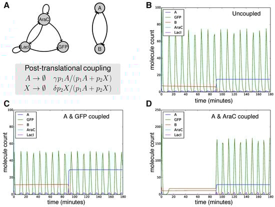 - Prindle, A.; Selimkhanov, J.; Li, H.; Razinkov, I.; Tsimring, L.S.; Hasty, J. Rapid and tunable post-translational coupling of genetic circuits. Nature 2014, 508, 387–391. [Google Scholar] [CrossRef] [PubMed]
