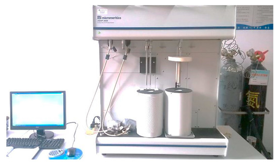 The ASAP2020M (Micromeritics Instrument Corp, Norcross, GA, USA) automatic analyzer for SSA and micropores (Figure 2) was employed. It can be used to analyze various parameters including single- and multi-point BET (Brunauer, Emmett, and Teller) SSA, Langmuir SSA, pore size distribution, and pore volume according to a static gauging method for isothermal physical adsorption. It is a classical method for measuring the samples whose SSA is greater than 1 m2/g. Before preparing samples, it is necessary to clean the sample cell using ethyl alcohol or acetone and then dry it. Three grams of experimental coal samples (four types of each) were separately weighed and stored. Moreover, the sample cells and tube plugs were labeled.