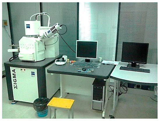 The applied ΣIGMA SEM (Carl Zeiss AG, Oberkochen, Baden-Württemberg, Germany) (Figure 3) was characterized by a digital control system whose acceleration voltage was in the range 0.1 to 30 kV, and it can be magnified by 12,000 to 500,000 times. Equipped with a zoom focusing system with high resolution and high precision, it can be used to analyze microstructures of powdery, blocky, and thin-film samples.