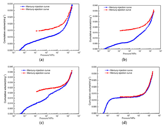 According to the initial data of mercury intrusion experiment, the mercury-injection and mercury-ejection curves of the four types of coal samples were plotted (Figure 4). The curves were divided into two types: Figure 4a–c are classified as the first type while Figure 4d is belonged to the other.