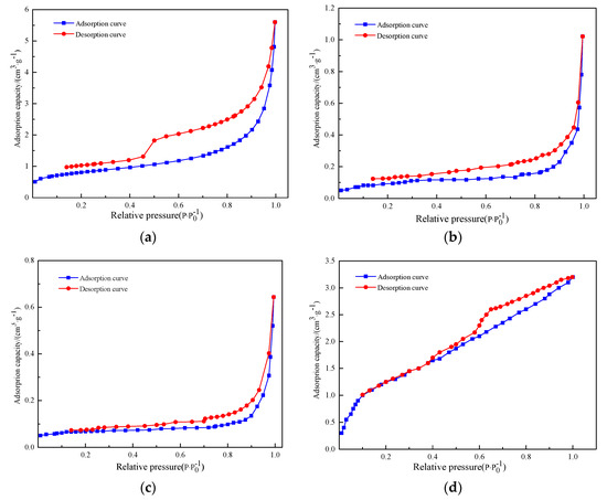 The low-temperature nitrogen adsorption and desorption isotherms of soft coal in Figure 5a–c all belong to IV-type isotherms (based on International Union of Pure and Applied Chemistry (IUPAC)), showing different sizes of adsorption hysteresis loops. Shapes of the hysteresis loops can reflect the characteristic of the pore structure. As shown in Figure 5b,c, the adsorption hysteresis loops in the curves of the coal samples were small, indicating that impermeable pores were found in coal samples, and the adsorption curves were bulged, which indicated that there was significant interaction between coal masses and nitrogen and therefore many micropores could be found in the coal. When the relative pressure exceeded 0.8, the adsorption–desorption curves suddenly increased, reflecting the poor permeability of the coal.