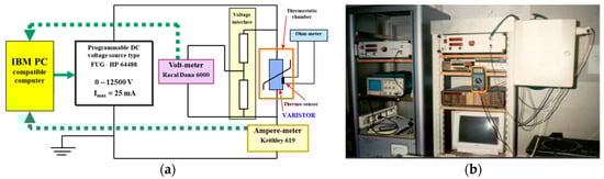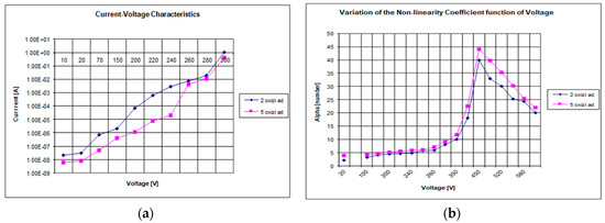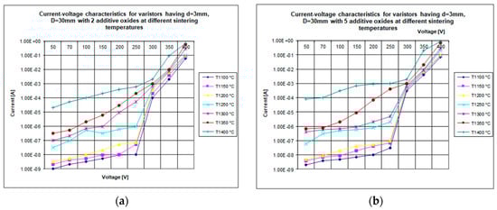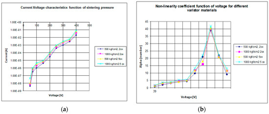 Figure 9a presents the family of current-voltage characteristics obtained by these tests, having the sintering pressure as a parameter. The tests were made between 50 and 400 V in DC regime, assuming that the opening voltage of these varistors is around 300 VDC.