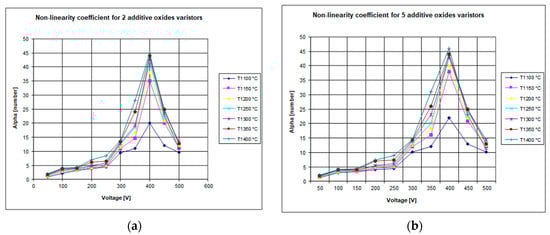 Figure 9b describes the family of characteristics for the nonlinearity coefficient according to the voltage obtained by these tests, having as parameters the two materials with 2 and 5 additive oxides, with two sintering pressures, made as 500 and 1000 kgf/cm
