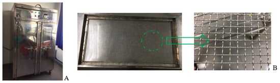 Figure 2. Convection dryer (A) and tray (B) used in this study.