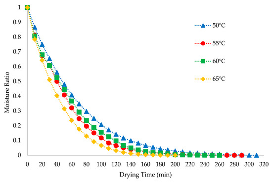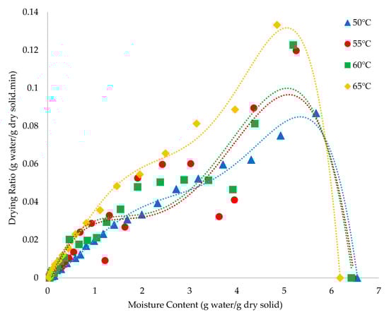 Figure 4 shows the drying rate curves of lemongrass slices at different temperatures. Evidently, higher drying temperature was associated with increased drying rate. Since higher temperature induces more heat transfer to the sample, which in turn leads to increased moisture diffusion to the inside and the outside of the materials, moisture removal was accelerated at higher air-drying temperatures. On the other hand, the drying process pattern described in Figure 4 only exhibited two periods—the initial and falling-rate periods. This is different from a standard drying process consisting of three periods: (i) initial period, (ii) constant-rate period, and (iii) falling-rate period. To be specific, the period starting from the initial moisture content to the moisture content of 5 g water/g dry matter coincided with the initial drying period and the period with moisture of higher than 5 g water/g dry matter represented the falling-rate period. The absence of the constant drying rate could be explained by the thin-layer arrangement and the high flow of the drying agent, which quickly accelerates evaporation and circumvents the saturation state of the material. Recent studies have also shown that the constant rate period was absent in the drying processes of fruits and vegetables, since this period often occurs very quickly [25]. At very low moisture content, of less than 0.2 g water/g dry matter, differences between drying rates of the four temperature levels were indistinguishable. This could be mainly due to the lack of water after the removal of free moisture, leading to the diversion of thermal energy into the breaking of bonds instead of heating water molecules. However, since the remaining water molecules were strongly bond to the cellulose fibers, increasing drying temperature from 50 to 65 °C was inadequate to induce a noticeable change in drying rate for lemongrass materials with low moisture.