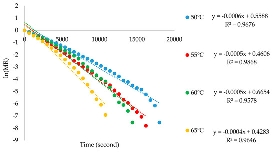 Figure 5 shows the approximated linear relationship between ln(MR) and drying time (t) at different drying temperatures of 50, 55, 60 and 65 °C. Linear regression was used to calculate the effective moisture diffusion coefficient. The effective moisture diffusion coefficient and the R2 correlation coefficient correspond to each temperature and were calculated by linear regression of experimental value. ln(MR) (dimensionless) with drying time (t) (second) are presented in Table 3.