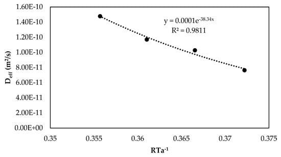 The graph of the change in Deff value (RTa−1) is displayed in Figure 6. Using exponential regression, the activation energy of Ea of sliced lemongrass was determined to be 38.34 kJ/mol. This result is consistent with the normal range of 33.21 to 39.03 kJ/mol in the drying process of basil leaf [25]. To compare, for activation energy of fruits and vegetables, more than 90% of the activation energy values that were found in previous studies ranged between 14.42 and 43.26 kJ/mol, and 8% of the values were in the range 78.93 to 130.61 kJ/mol [25]. The present result of the activation energy for lemongrass moisture evaporation is relatively high. As a result, the separation of moisture from lemongrass could be difficult, suggesting that, in order to completely dry the lemongrass material, either drying duration or drying temperature should be set at high levels.
