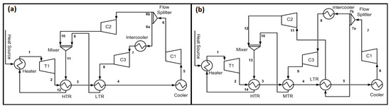 Supercritical CO2 (S-CO2) power cycle layouts: (a) recompression Brayton cycle (RBC) with partial cooling and (b) RBC with partial cooling and improved heat regeneration. LTR: low-temperature recuperator; HTR: high-temperature recuperator. Layouts (a) adapted from [17].