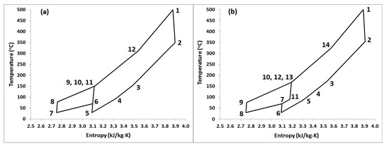 A temperature–entropy diagram for different S-CO2 Brayton cycle layouts: (a) RBC-PC, and (b) RBC-PC with improved heat regeneration (RBC-PC-IHR). The highest temperature of the cycle is 500 °C.