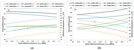 Cycle thermal efficiency (solid lines) and minimum pinch temperature in the heat exchanger (dashed lines) plotted as a function of the cycle’s minimum pressure () for (a) RBC-PC and (b) RBC-PC-IHR. The turbine inlet pressure (TIP) was set to 25 MPa or 16 MPa for turbine inlet temperatures (TIT) of 850 °C and 500 °C. The red dot shows the near-optimal value for the cycle’s minimum pressure.