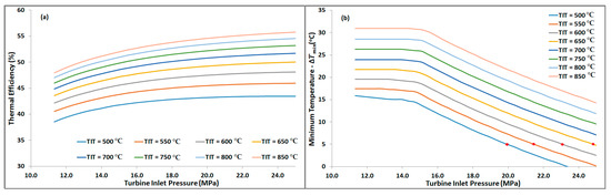 (a) Thermal efficiencies of RBC-PC plotted versus turbine inlet pressure for TIT from 500 °C to 850 °C. (b) Minimum pinch temperature versus turbine inlet pressure; red dots represent the minimum pinch temperature of 5 °C.