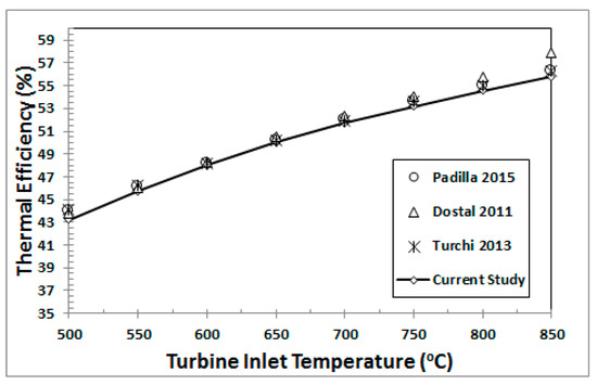 The simulation results for the base cycle, i.e., RBC-PC, were validated using data already published by Kulhánek and Dostál [11], Turchi et al. [16], and Padilla et al. [17]. Figure 4 presents the effect of the turbine inlet pressure on the efficiency and minimum pinch temperature at different turbine inlet temperatures from 500 °C to 850 °C. The thermal efficiency increases monotonically with increasing turbine inlet pressure and temperature, as shown in Figure 4a. For a given turbine inlet temperature, the minimum pinch temperature decreases linearly for a turbine inlet pressure above 16 MPa, as shown in Figure 4b. Thus, for a given turbine inlet temperature, the maximum cycle efficiency is restricted by the condition of the minimum allowable pinch temperature. In the current study, the minimum pinch temperature is 5 °C; thus, the red dots in Figure 4b represent the near-optimal operating pressures for each turbine inlet temperature, and their values are listed in Table 1. Figure 5 presents a plot of the thermal efficiency of the cycle versus turbine inlet temperatures. Data points taken from references [11,16,17] are also plotted for comparison. It is evident from the plots that the results produced by the current model agree well with those in the literature. Slight differences between our data and published data could be a result of differences in the thermodynamic properties databases used in this simulation and in published models.