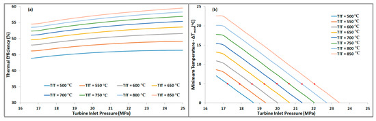 (a) Thermal efficiencies of the RBC-PC-IHR plotted versus turbine inlet pressure for TIT from 500 °C to 850 °C. (b) Minimum pinch temperature versus turbine inlet pressure; red dots represent the minimum pinch temperature of 5 °C.