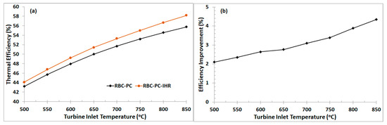 The thermal efficiency of the RBC-PC-IHR configuration is plotted in Figure 7a along with the efficiency of the RBC-PC at different turbine inlet temperatures. A significant increase in thermal efficiency for the RBC-RC-IHR configuration is noted, especially at high turbine inlet temperatures. Figure 7b is plotted to compare the efficiency improvement (in percentage points) offered by the RBC-PC-IHR layout in comparison to the RBC-PC. A minimum efficiency increase of 2% occurs at a turbine inlet temperature of 500 °C, and this increases to nearly 4.5% by 800 °C.