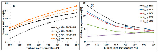 (a) The thermal efficiencies of RBC-PC-IHR and RBC-PC plotted versus turbine inlet temperatures from 500 °C to 850 °C. (b) The improvement in thermal efficiency from RBC-PC-IHR compared to RBC-PC in percentage points.