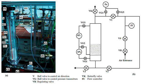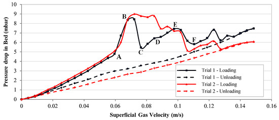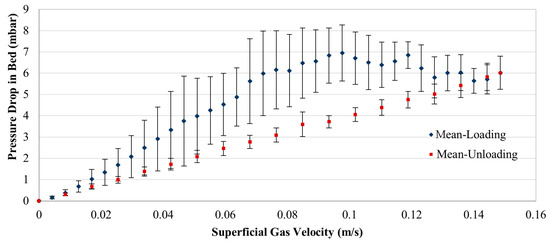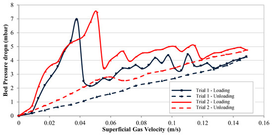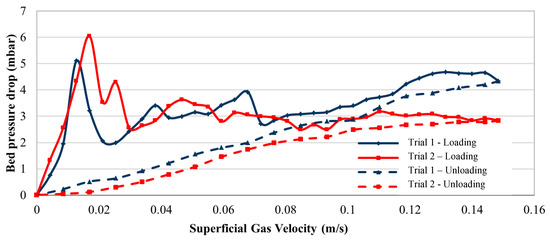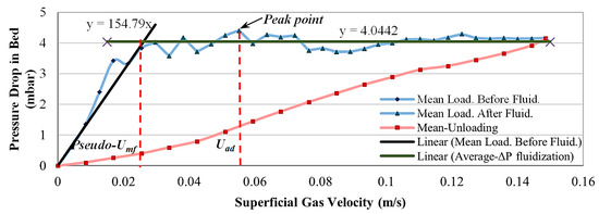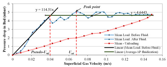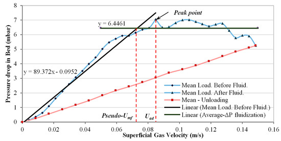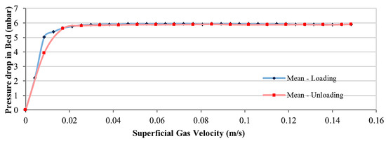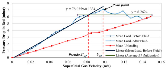 To estimate the size of the formed agglomerates in each part of the fluidization tests of different mixtures of materials, the Ergun equation (Equation (12)) along with Wen & Yu equation (Equation (3)) can be used to calculate the mean value of agglomerates’ size. Considering the Ergun equation for the linear part (packed bed condition) of the fluidization curve, the mean value of agglomerate size in the three conditions (1. the initial phase of loading (near-zero velocity), 2. at slightly higher gas velocities in the fixed bed condition of loading, as well as 3. near to rest (near-zero velocity) state in the unloading condition), can be calculated as:
