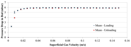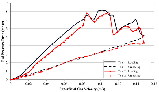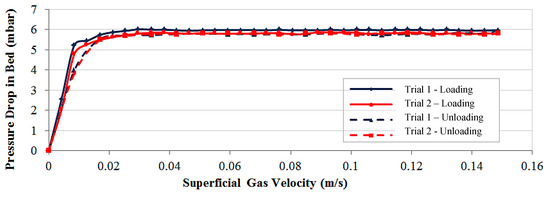 , in the fixed bed state, the pressure drop increases linearly when increasing the superficial gas velocity. According to Ergun’s equation [