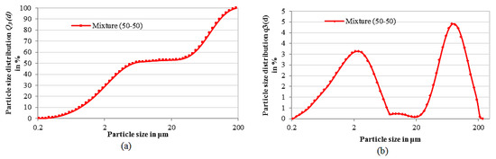 Figure 8 shows the cumulative distribution function and probability density function of the particle size for a binary mixture of 50% ultra-fine and 50% fine particles, illustrating the typical distribution of particle size in such binary mixtures.
