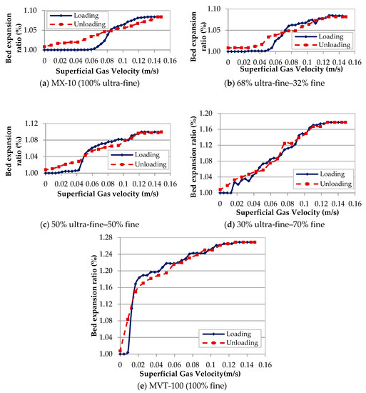 according to Equation (16) reveal that a mixture containing 20% of ultra-fines is expected to be fluidized for superficial gas velocities higher than 39.5 cm/s (i.e., this gas velocity corresponds to