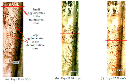 Figure 21 shows the fluidized agglomerates formed in the ultra-fine powder fluidized bed for three different superficial gas velocities. Due to the sticking of the ultra-fine particles to the walls leading to the build-up of an opaque layer, a detailed optical analysis is not possible in general. However, these images reveal the general morphology of semi-spherical fluidized agglomerates. Considering the size distribution of the powders for this material (<10 μm), all of the observed semi-spherical objects in this figure are the formed agglomerates during the fluidization process. The size of agglomerates varies from almost 3 mm at the bottom of the de-fluidized region to dozens of micrometres for the spouting agglomerates in the channel opening. The fluidized and de-fluidized zones are separated by red lines in each picture.