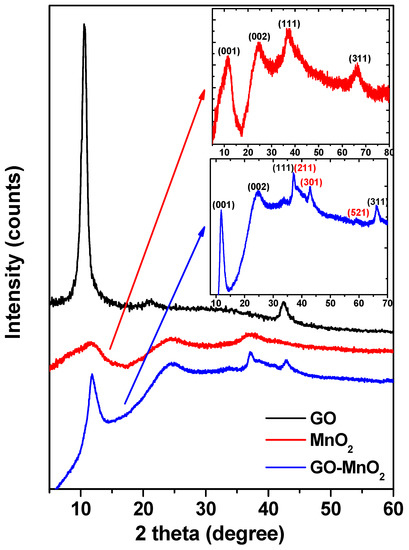 The XRD patterns of GO, MnO2, and GO-MnO2 are presented in Figure 1. The characteristic (001) peak of graphite oxide centered at 2θ = 10.3° is indicative of the successful oxidation of graphite into graphite oxide [39].