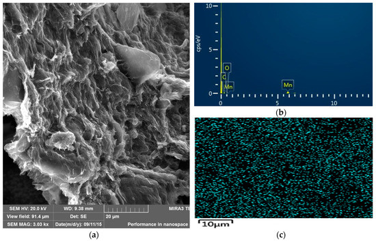 (a) SEM images of GO-MnO2 nanocomposite; (b) SEM-EDS; (c) SEM-maps of the manganese distribution on the GO-MnO nanocomposite.