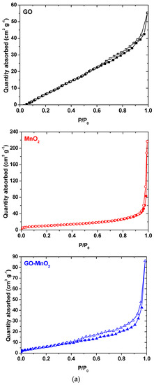 The textural changes, illustrated by the pore size distribution curves derived from density functional theory (DFT) calculations, are presented in Figure 3b. The GO-MnO2 composite was more porous than the parent GO and less porous than MnO2. During the composite formation, GO was oxidized, and defects that were created in the graphene layers contributed to the increase in porosity. MnO2 prepared could be considered a porous oxide with a surface area comparable to those previously reported [45,46].