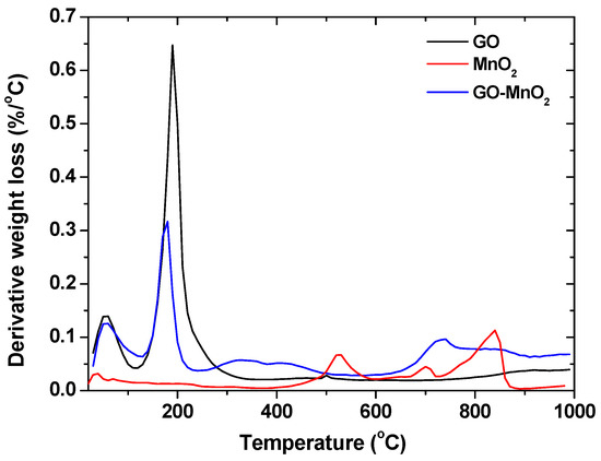 Differential thermogravimetric (DTG) curves (measured in nitrogen atmosphere) for MnO2, GO-MnO2, and GO are presented in Figure 4 for the sake of comparison. For all materials, the peaks at about 100 °C represented the removal of adsorbed water, while for MnO2, the peak at about 200 °C represented the dehydration of crystal water of manganese oxide [47,48]. For GO-MnO2, the peak at about 200–250 °C was due to the mass loss from the removal of the oxygen-containing functional surface groups. For the GO-MnO2 composite, a decrease in the peak intensity was seen and was due to the decrease in the oxygen containing surface groups after the composite formation. The complex peaks between 300 and 600 °C may represent the reduction of Mn(IV) to Mn(II) with a loss of oxygen [49]. MnO2 was reduced to Mn2O3 [30] and then to Mn3O4 and MnO. Then, Mn(II) was reduced between 750 and 800 °C.