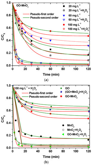 The application of GO-MnO2 for RB5 degradation was also studied with the addition of H2O2 for 20 and 100 mg L−1 initial RB5 solution concentrations, and the results are presented in Figure 6a. These results convey that the increase in the initial concentration resulted in a decrease in the percentage of removal/degradation of the dye. Experiments in the presence of H2O2—but in the absence of catalyst—presented no decolorization of the solution. In presence of catalysts, the addition of H2O2 resulted in an increase in the removal/degradation. The percentage increase was different for the different initial concentration. The lower concentration resulted in a lower increase, indicating that the ratio C0 RB5/mM H2O2 is a crucial parameter.