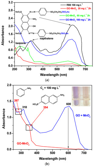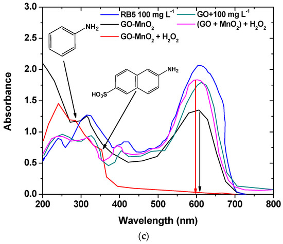 The degradation activity of the GO-MnO2 was also investigated spectroscopically by monitoring the decolorization efficiency in UV-Vis spectra (250–750 nm). Figure 7a shows the UV-vis spectra of the 100, 60, and 20 ppm RB5 aqueous solutions after 2 h contact time, with GO-MnO2 suspension at pH 3 in the absence of H2O2, along with the UV-vis spectra of the 100 ppm RB5 initial solution. From Figure 7a, it is seen that for the initial RB5 solution, the maximum absorbance was presented at λmax ~599 nm in the visible region, which could be attributed to the –N=N– azo bond of the dye. The intensity of this peak was relative to the azo dye concentration in the solution [56,57], and the blue color of the dye was attributed to the n→p transition of the non-bonding electrons to the anti-banding pi-group orbital of the double bond system. With the decrease in the concentration of the initial RB5 solution, the intensity of this band decreased due to the decolorization of the solution and the possible cleavage of the azo bonds for the formation of –NH2 groups.