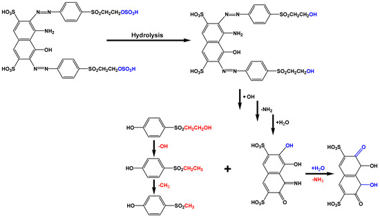 The cleavage of the azo bonds could lead to the generation of alkylsulfonyl phenolic compounds since the hydroxyl radicals could destroy the conjugated pi-systems according to Figure 9: