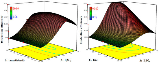 The 3D Response surfaces were plotted to understand both the main and interactive effects between two affected parameters. Figure 9 summarized the interaction of each affected parameter. The results showed that the reduction efficiency of chromium first increased with the increase of dosage of H2SO4, while other parameters held constant and then decreased as the volume of H2SO4 > 0.8 mL. Also, reaction time and reaction temperature were important parameters affecting the reduction efficiency, which was consistent with the common results. The current intensity had no obvious influence on the reduction efficiency; it was only needed to apply an appropriate potential or current intensity during the process.