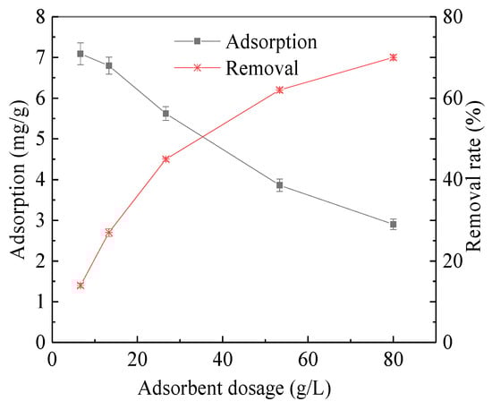 The change of TOC removal rate and unit adsorption quantity under different adsorbent dosage is shown in Figure 1. With the addition of adsorbent, the adsorption and the removal rate increased. At a dosage of 80 g/L (from 6 g coking coal to 75 mL solution, similarly hereinafter), the removal rate can reach 70.18%. As the coking coal dosage increased from 6.67 g/L to 80 g/L, the adsorption capacity decreased from 7.09 mg/g to 2.9 mg/g.