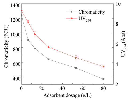 The changes of Cl− concentration and EC value, UV254, chromaticity and TOC under different adsorbent additions are shown in Figure 2 and Figure 3, respectively. There was no change in Cl− concentration and EC value, because of coking coal is difficult to adsorb polar substances; UV254 and chromaticity decrease significantly with the increase of adsorbent addition When coking coal dosage was 80 g/L, UV254 decreased from 9.42 Abs to 3.77 Abs and the chromaticity decreased from 1243 PCU to 271 PCU, with removal rates of 70.15% and 59.55%, respectively. The UV254 index reflects humic macromolecular organics and aromatic compounds containing C=C double bonds and C=O double bonds, which is the most typical toxic and refractory organic matter in coal chemical wastewater; Chromaticity can also macroscopically characterize the concentration of humic macromolecular organics. Moreover, the above two indicators have a good correlation, which confirms the adsorption of organic matter in ROC by coking coal, indicating that coking coal is suitable for the separation of organic and inorganic components in ROC.