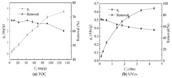 TOC and UV254 as a function of adsorption time are presented in Figure 7a. It can be seen from the Figure 7a that the adsorption of coking coal for TOC and UV254 was rapid in the first 45 min and was basically balanced at 9 h. In order to further study its adsorption mechanism, quasi-first-order kinetics and quasi-second-order kinetic models were used to explain the adsorption process [] and the fitted value was obtained by fitting the linear intercept, as shown in Figure 7b,c. The quasi-first-order kinetics and quasi-second-order kinetic model parameters obtained are given in Table 4. The qe, which was obtained by linear fitting of the quasi-second-order equation, was closer to the real value, so the quasi-second-order equation can explain the adsorption process of coking coal better. The adsorption rate of humic macromolecular organics and aromatic compounds (UV254, K2 = 0.0868) is higher than that of the total organic (TOC, K2 = 0.0138).