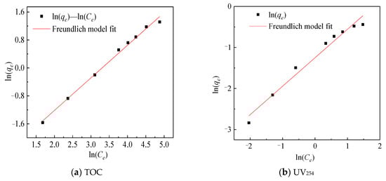 The Freundlich isotherm, which is the earliest known relationship describing the adsorption isotherm, is an empirical equation employed to describe heterogeneous systems []. The ordinary adsorption isotherm is expressed by the following equation as shown in Equation (3). The ratio of the solute to the solute concentration adsorbed on the adsorption surface is the function of solute concentration. The function is obtained by taking the logarithm into a linear form of , as shown in Equation (4). According to experimental experience, it is easy to adsorb when 1/n is 0.1 to 1 and harder to adsorb when 1/n is greater than 2.