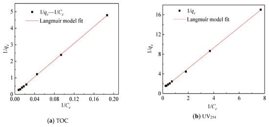 The adsorption isotherm is drawn by the equilibrium adsorption concentration and the equilibrium adsorption amount []. As shown in Figure 4, the equilibrium adsorption amount increased with the initial concentration increased. The Freundlich and Langmuir adsorption models were used and the adsorption isotherms of TOC and UV254 were linearly fitted as shown in Figure 5 and Figure 6. The same method was used to fit the chromaticity adsorption isotherms. The results are shown in Table 3. From the fitting results of the Freundlich model, 1/n is between 0.5 and 1, so it is easy to be adsorbed. From the fitting results of the Langmuir model [], KL values of chromaticity, TOC and UV254 are sorted from large to small as follows: UV254 > chromaticity > TOC, therefore, coking coal is stronger adsorb macromolecular organic matter.