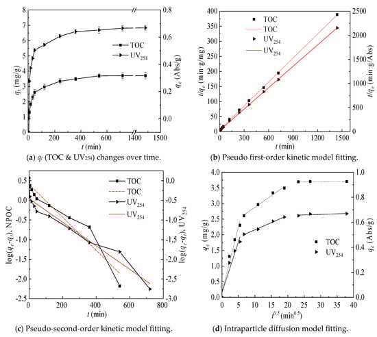 qt (TOC & UV254) changes over time and kinetics model fitting.