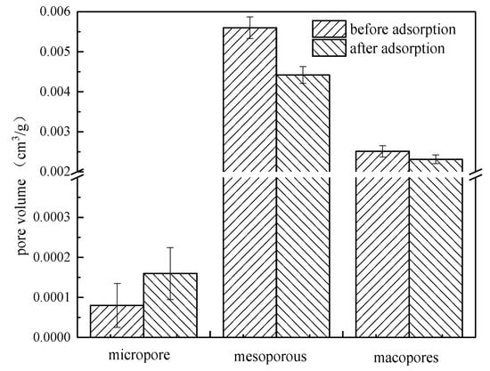 Pore volume changes with different pore sizes were further analyzed. The pore volume of each type before and after the absorption of ROC by coking coal, as shown in Figure 8. It can be seen from the figure that the decrease of mesoporous volume was the largest, while the decrease of macroporous volume was very small, with almost no micropores. Mesoporous adsorption plays an important role in the adsorption process, which was consistent with the conclusion of the intraparticle diffusion model.