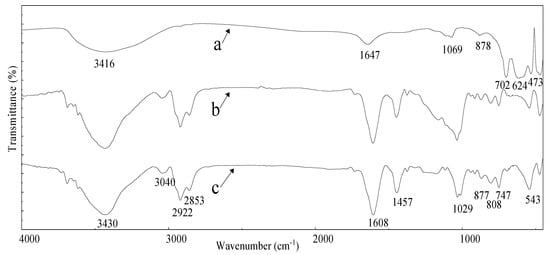 The FTIR of coking coal ROC before and after adsorption to and ROC itself are presented in Figure 9. Figure 9 shows the hydrogen-hydrogen bond stretching vibration of coking coal is at 3430 cm−1 and the CH2 stretching vibration of aliphatic hydrocarbons is characterized at 2922 cm−1 and 2853 cm−1 [], near 1440 cm−1 is the deformation vibration of CH2 and CH3. The aromatic structure has three types of characteristic absorption peaks. The vicinity of 1600 cm−1 is the aromatic C=C skeleton vibration; the vicinity of 3040 cm−1 is the aromatic C-H stretching vibration; and the 747 cm−1, 808 cm−1 and 877 cm−1 is the aromatic C-H out-of-plane deformation vibration [,].