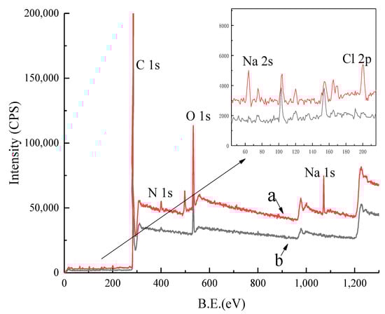The XPS results of coking coal and coking coal after ROC adsorption are shown in Figure 10. The spectrum of the coking coal before adsorption indicates that the content of C element is high, while the content of O element and N element is low. After coking coal adsorbed ROC, the surface of coking coal was mainly covered by C, O and N and the characteristic peaks of Na and Cl were detected.