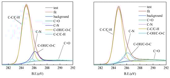 The XPS fitting spectrum of C(1s) in coking coal before adsorption (left) and coking coal after adsorption (right).