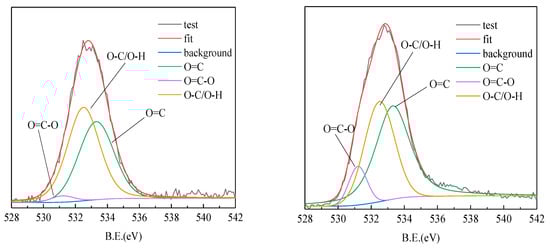 The XPS fitting spectrum of O(1s) in coking coal before adsorption (left) and coking coal after adsorption (right).