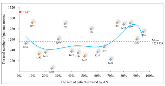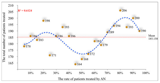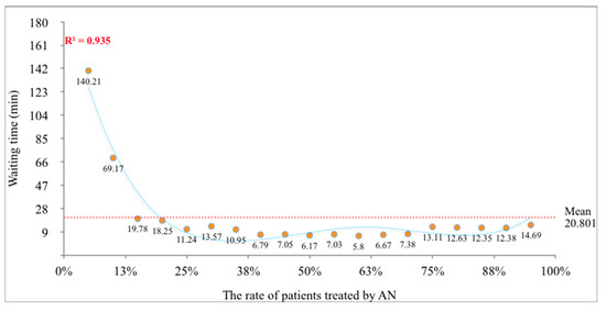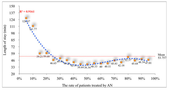 The relationship between the length of stay and the rate of patients treated by AN is shown in Figure 9. The rate of patients treated by AN showed a fourth-degree polynomial distribution with an increase, and the length of stay in ESs decreased inversely. The average length of stay was computed as 54.192 min, which meant that a 34.28% improvement was reached. The mathematical formula of the length of stay is given as: