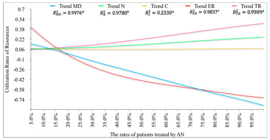 Effect AN employment on resources (a, b and c are expressed as fourth-, fifth- and sixth-degree nonlinear curves with high R2, respectively. MD: medical doctors; N: nurses; C: clerks; ER: exam rooms; TR: triage units).
