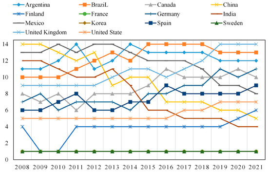 In contrary, the remaining countries and terms of Finland do not attain the productivity efficiency because their estimated scores are less than 1 and always fluctuate in every year. According to the final analysis result, 12 remaining countries, excluding Finland, always have the worst performance. These countries do not approach the top ranking, which only ranges from 5 to 14 from past to future. Especially, the forecasting scores indicate that the efficiency of Argentina, Brazil, Canada, Germany, and the United Kingdom will be dropped consecutively in the future; in addition, their position will remain at the bottom points. China and India demonstrate an upward trend over the whole term, and they can increase sharply in the future; however, their efforts have not reached the productivity efficiency. Mexico, Spain, and United State display fluctuations smoothly in every year.