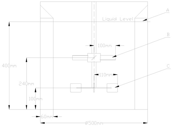 Geometrical dimension of the two-impeller stirred tank. Where (A) stands for the baffles, (B) represents the pitched blade impeller and (C) denotes the Rushton impeller.