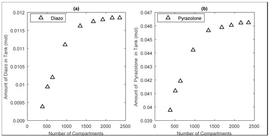 Convergence of predicted (a) Diazonium and (b) Pyrazolone distribution with number of compartments.