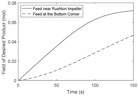 In this section, the influence of feeding location on mixing and reaction selectivity is studied. Two operating conditions with different feeding locations are compared; one is at the bottom corner of the reactor while the other one is at the tip of Rushton impeller. The feeding rate (1 mL/s) is kept constant throughout the simulation. In Figure 4 the yield trajectories of desired product are displayed when different feeding locations are adopted. Considering that stronger convective flow presents near impellers, in industry the injection point is usually placed in that region. Consistent with this empirical rule, this simulation suggests that feeding at the corner of the reactor significantly hindered the progress of reaction.